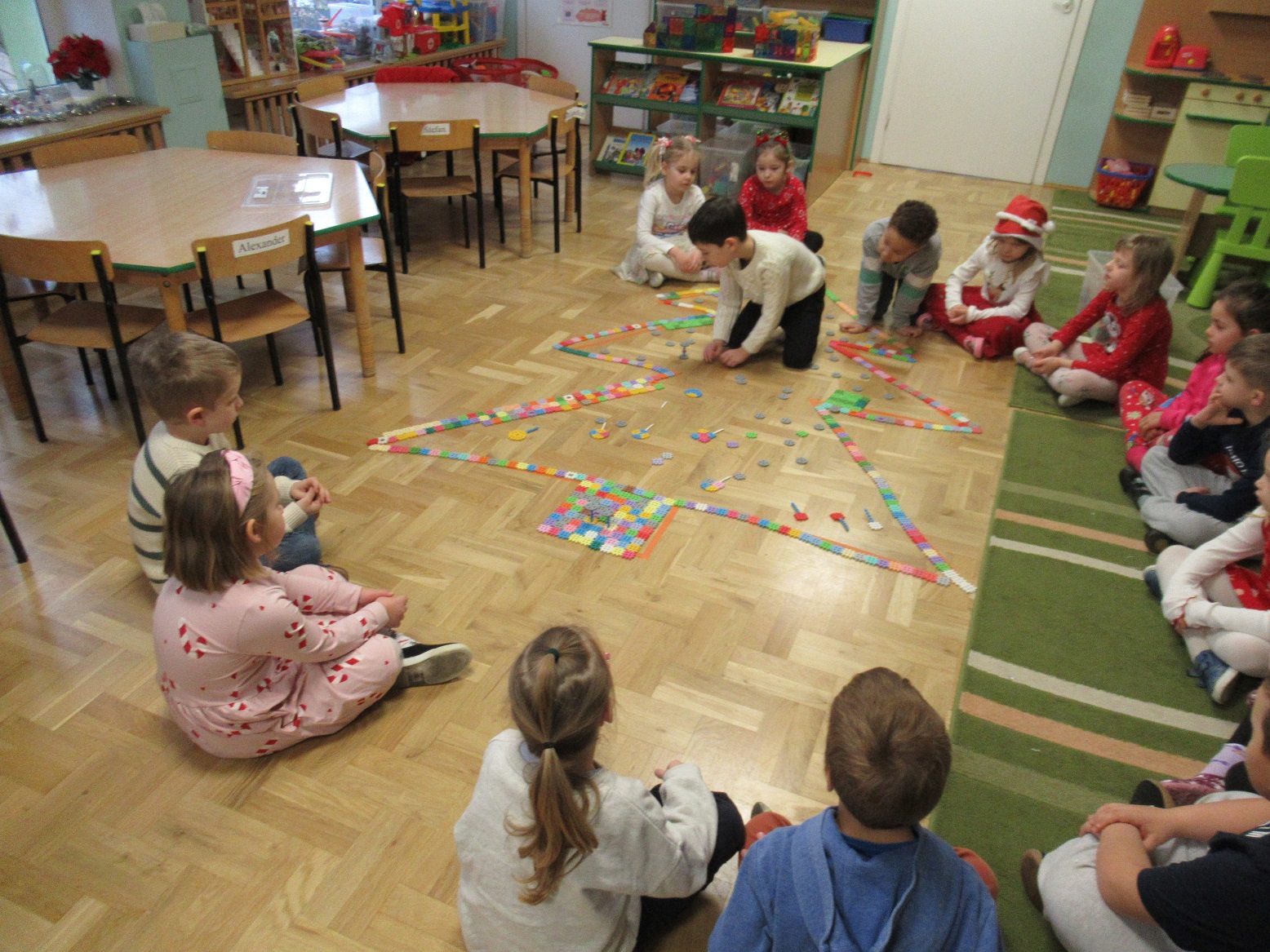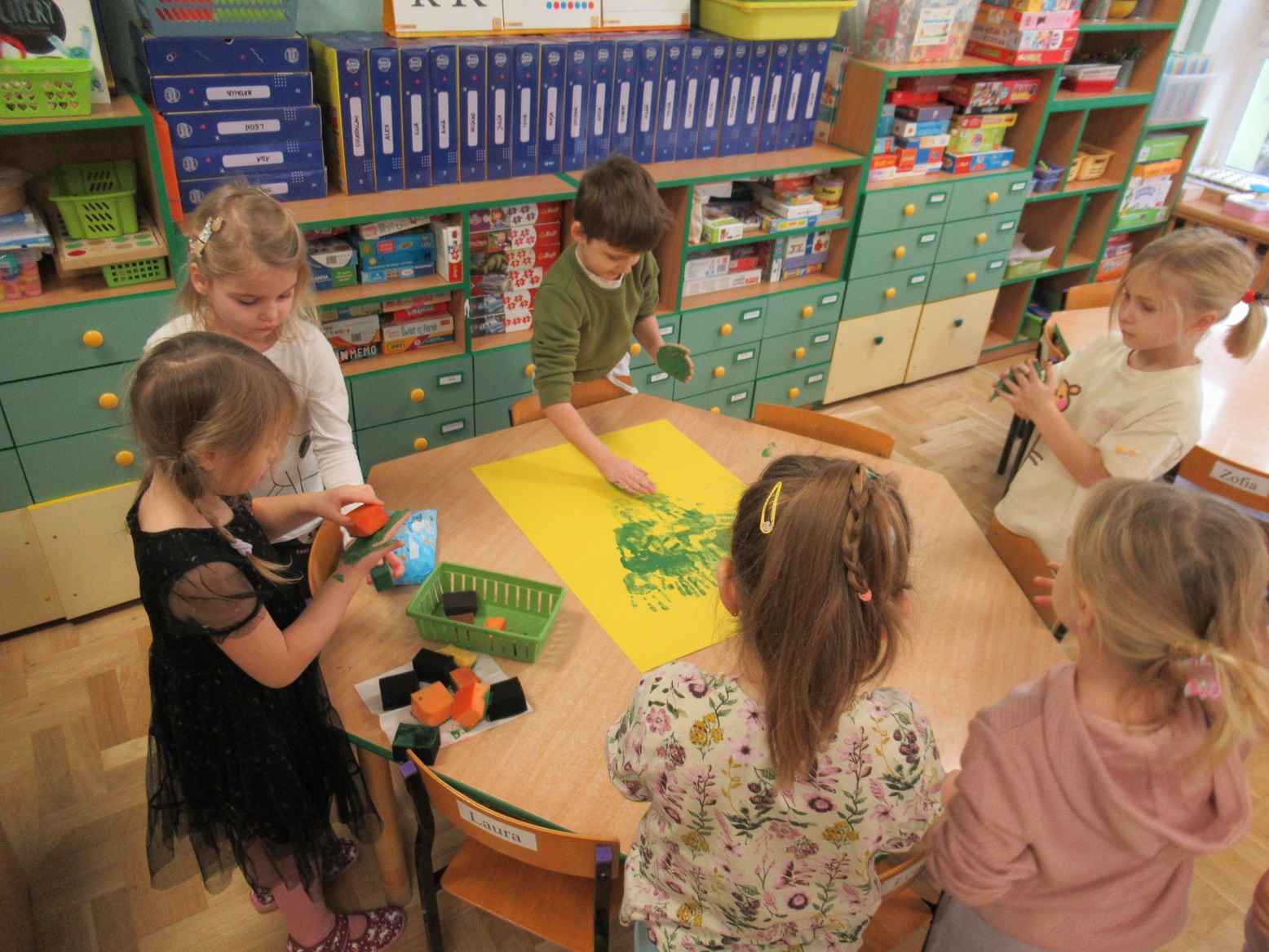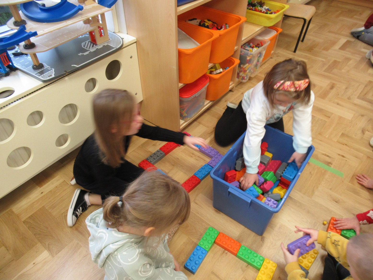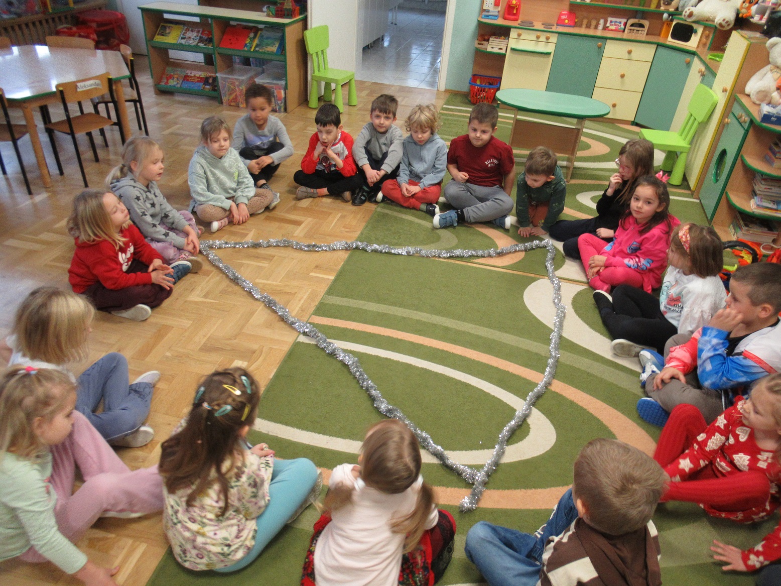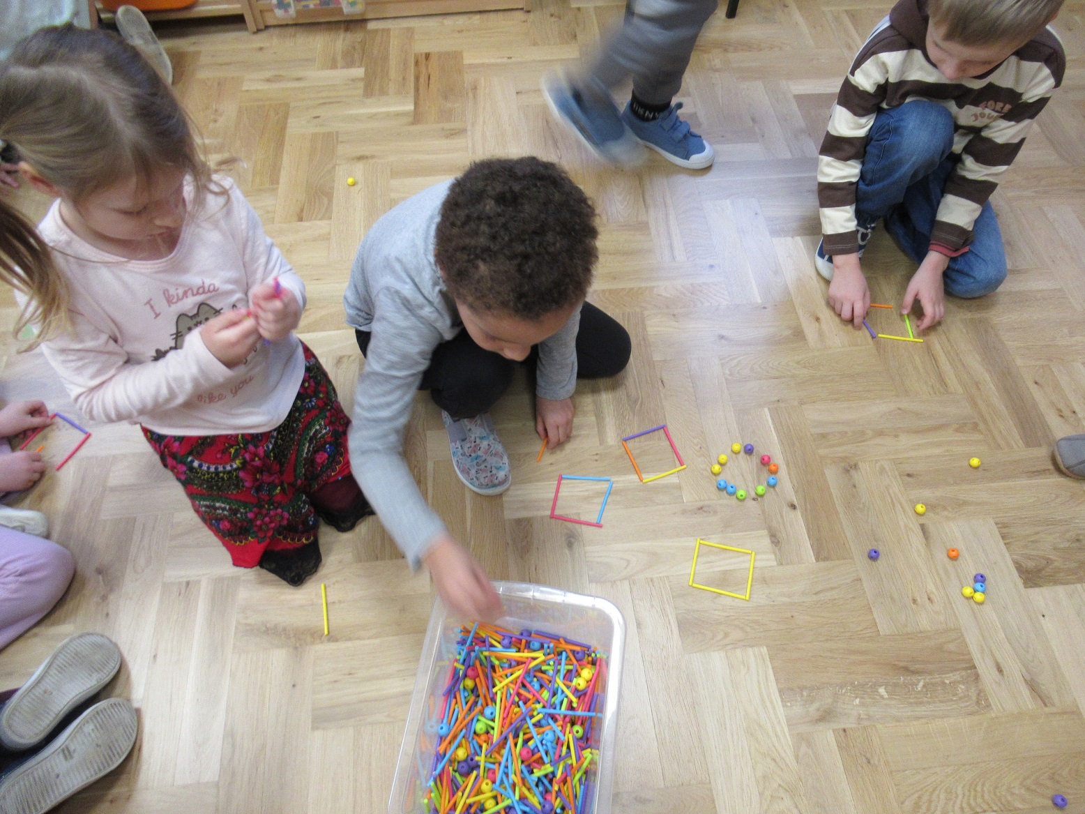 W ramach projektu „Matematyka w czterech porach roku” zajmowaliśmy się figurami geometrycznymi. Dzieci układały figury z klocków, patyczków i szarf oraz wyszukiwały figury geometryczne w sali.