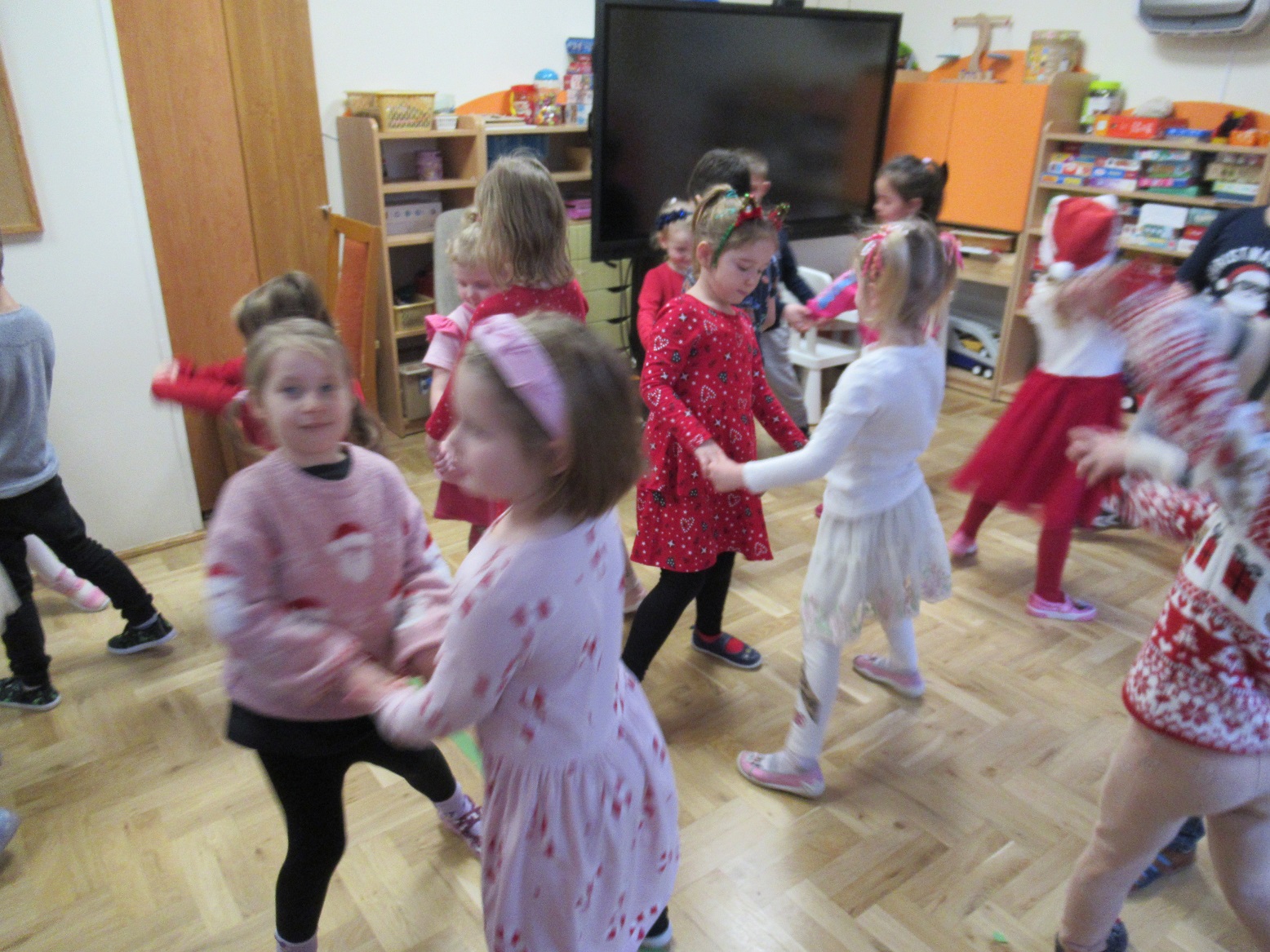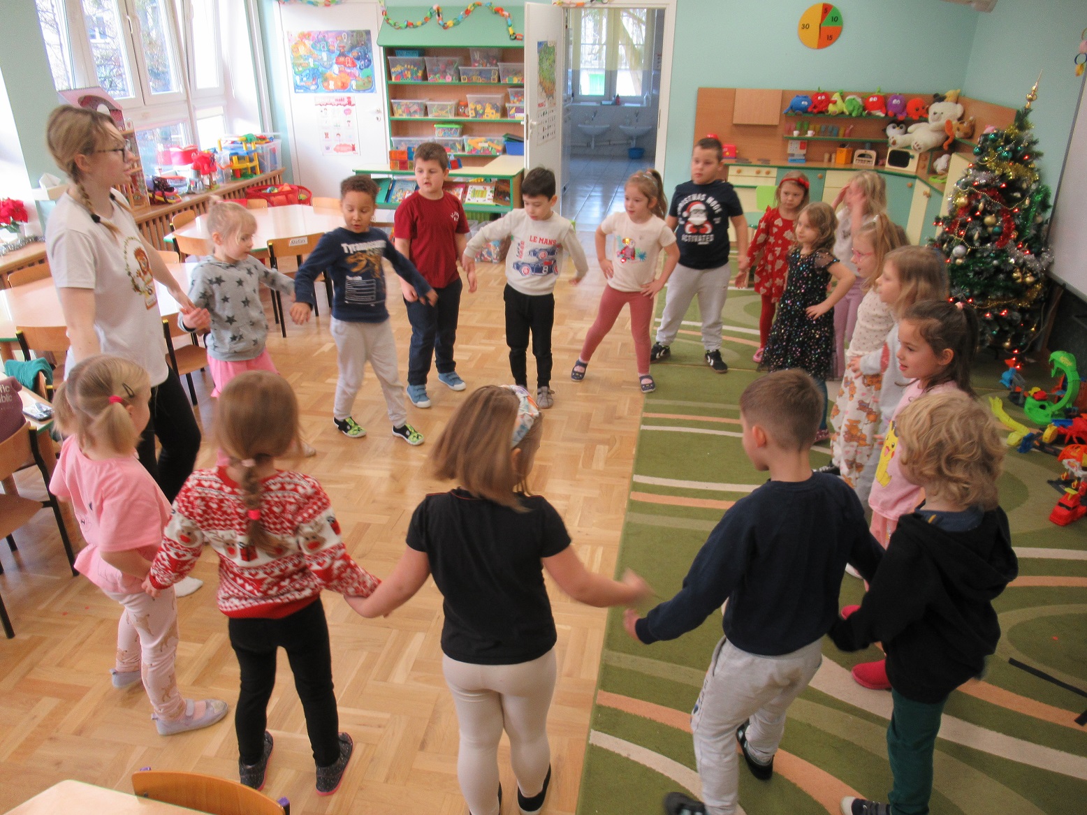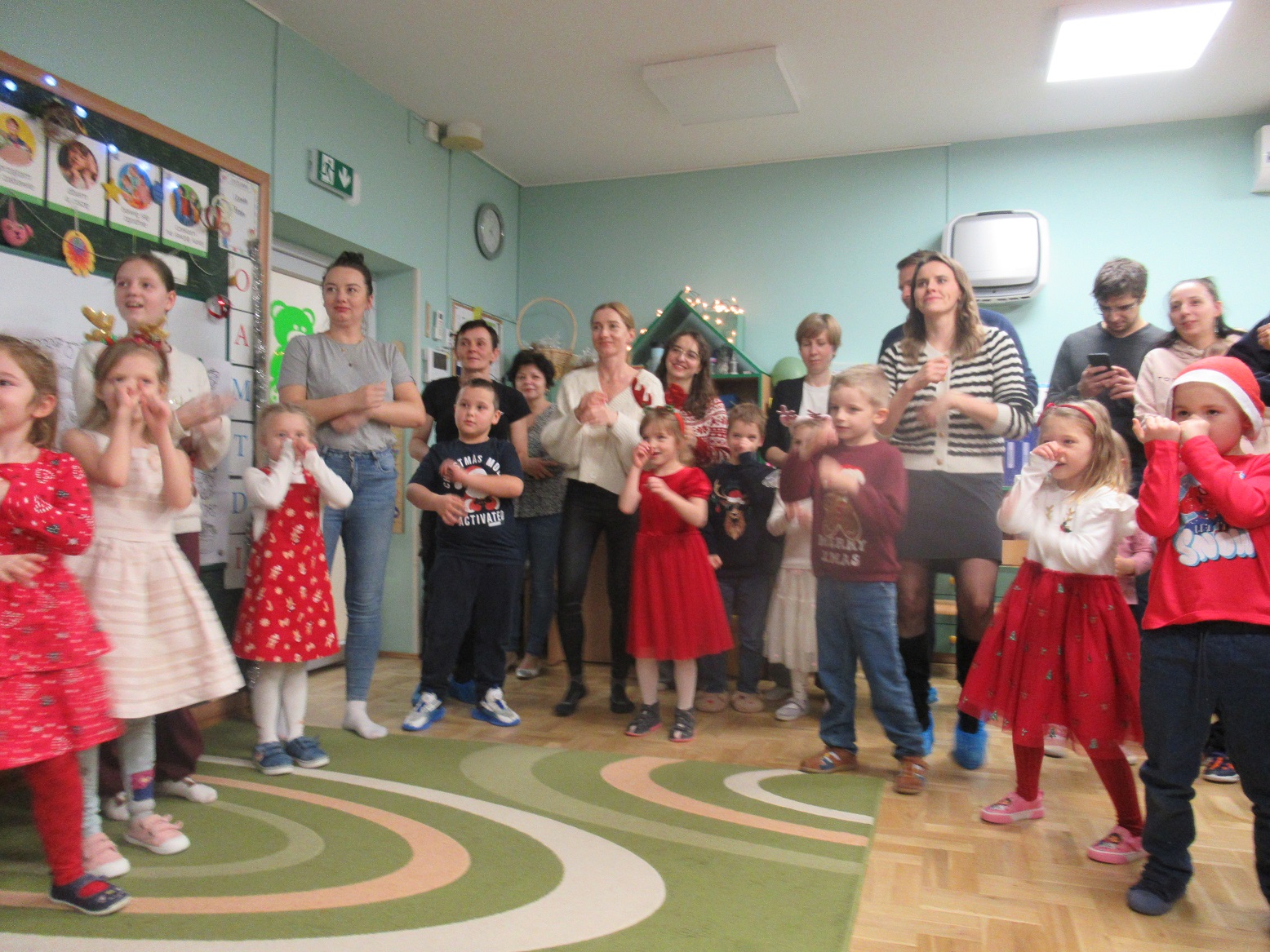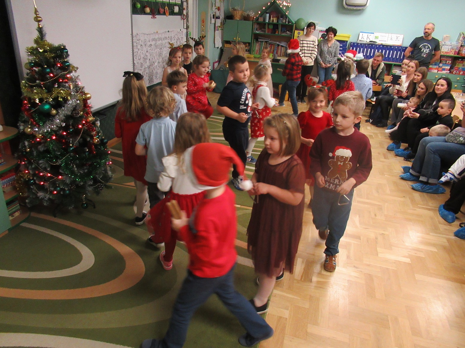 Odbyły się warsztaty świąteczne z rodzicami. Dzieci przygotowały dla nich krótki występ – pięknie grały na instrumentach i śpiewały kolędę. Następnie wspólnie bawiliśmy się przy muzyce. Dzieci wraz z rodzicami wykonały stroiki świąteczne oraz papierowe bombki. Była również duża świąteczna kolorowanka oraz niespodzianka dla rodziców – pierniczki samodzielnie przygotowane przez dzieci. Panowała bardzo rodzinna i radosna atmosfera.
