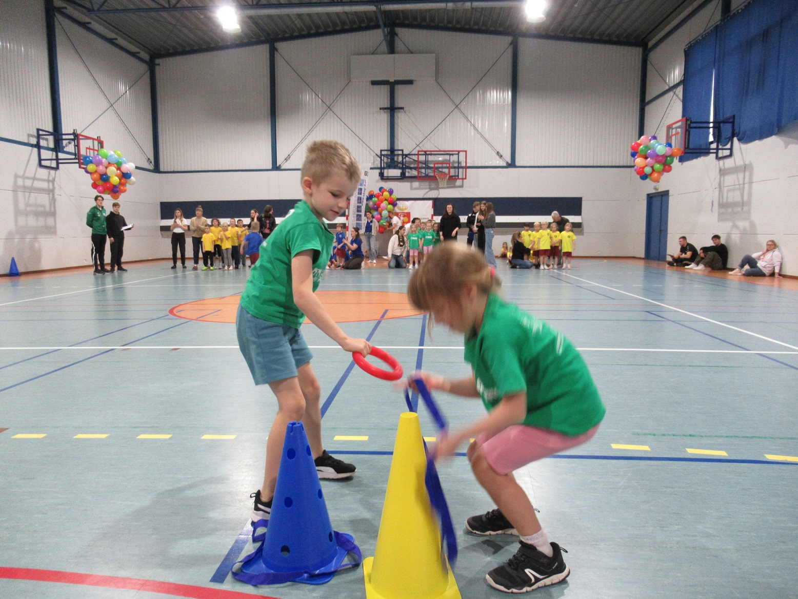 Część dzieci z naszej grupy brała udział w Przedszkolimpiadzie. Dzieci uczestniczyły w sportowych konkurencjach. Nasze przedszkole przeszło eliminacje i znalazło się w finale. Podczas drugiego dnia zawodów dzieci zdobyły puchar dla przedszkola, a każdy uczestnik otrzymał pamiątkowy medal. Było bardzo ciekawie i wesoło.
