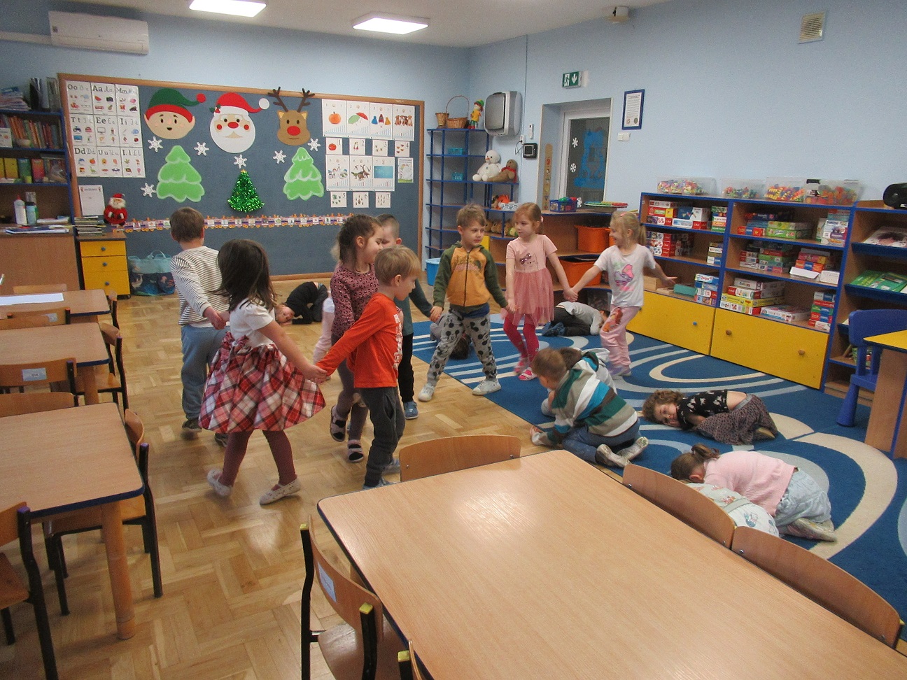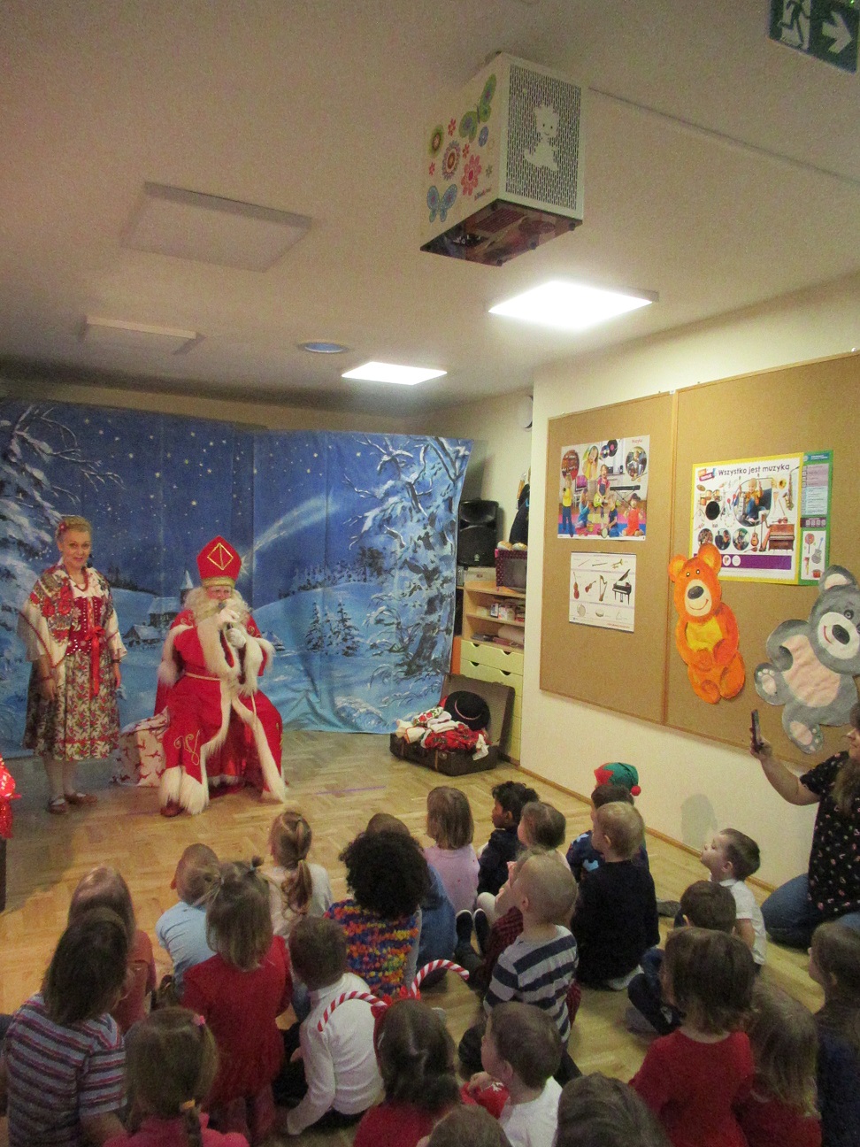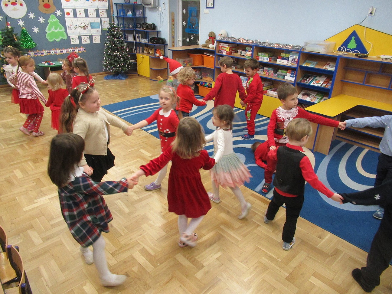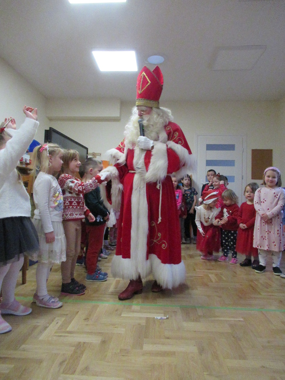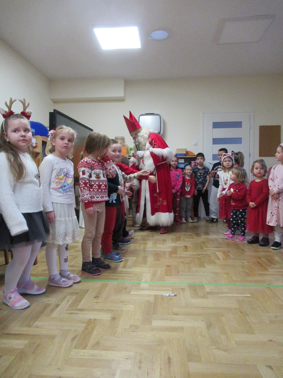 22.12. Święty Mikołaj spełnił swoją obietnicę i odwiedził nas w przedszkolu. Tym razem spędził z nami więcej czasu. Wspólnie z nim śpiewaliśmy i tańczyliśmy. Na koniec otrzymaliśmy drobne prezenty. Było bardzo wesoło i świątecznie.