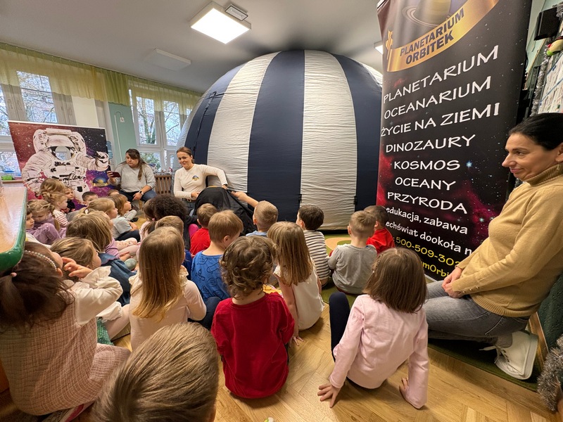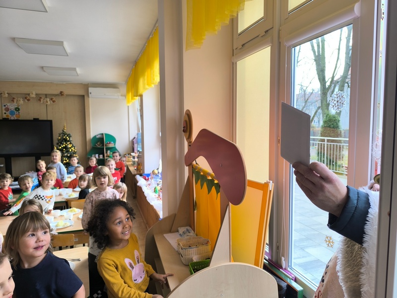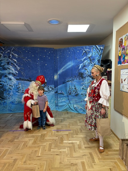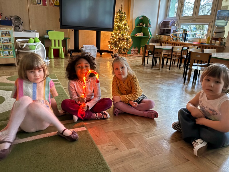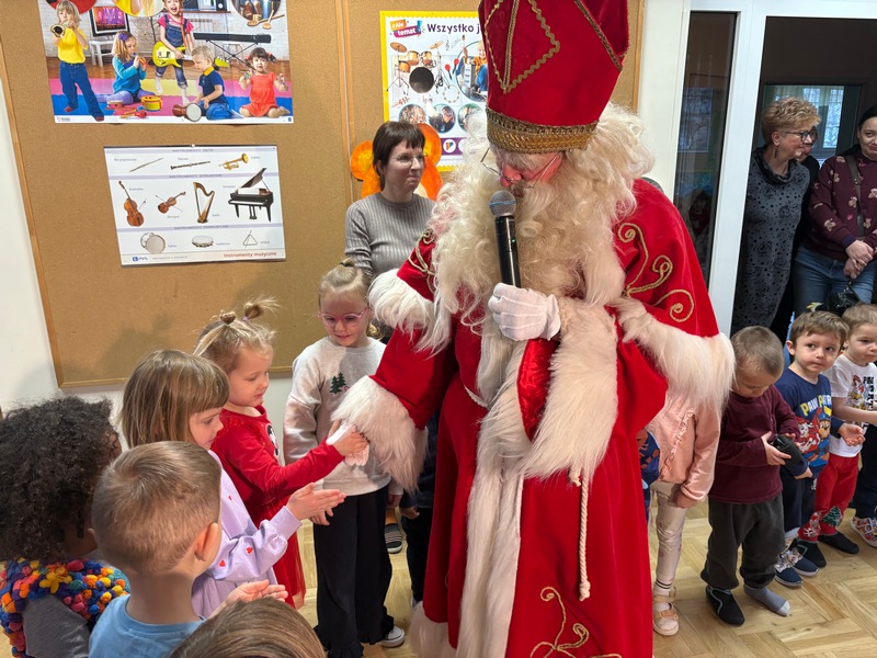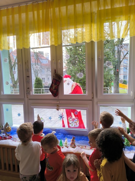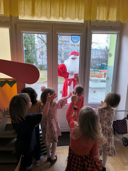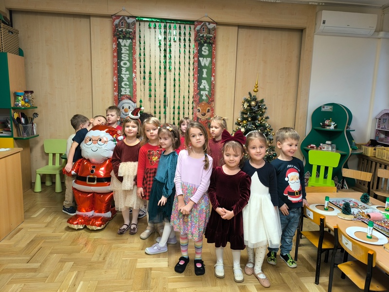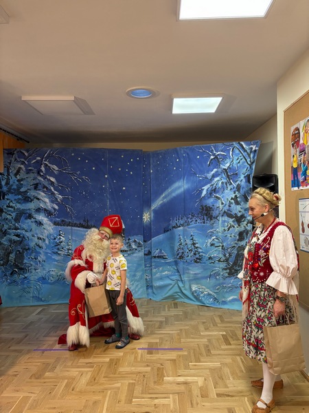 …wydarzeniem miesiąca było dla nas spotkanie ze Św. Mikołajem, który odwiedził nas aż dwa razu: szóstego grudnia i tuż przed świętami. Za pierwszym razem bardzo się spieszył, dlatego wręczył nam list informujący o niespodziance jaką dla nas przygotował – udziału w warsztatach „Mikołajkowe Planetarium”. Drugie spotkanie trwało znacznie dłużej – były wspólne zabawy, tańce i śpiewanie kolęd. Każdy z nas zrobił sobie zdjęcie z tym niezwykłym gościem i odebrał swój prezent.