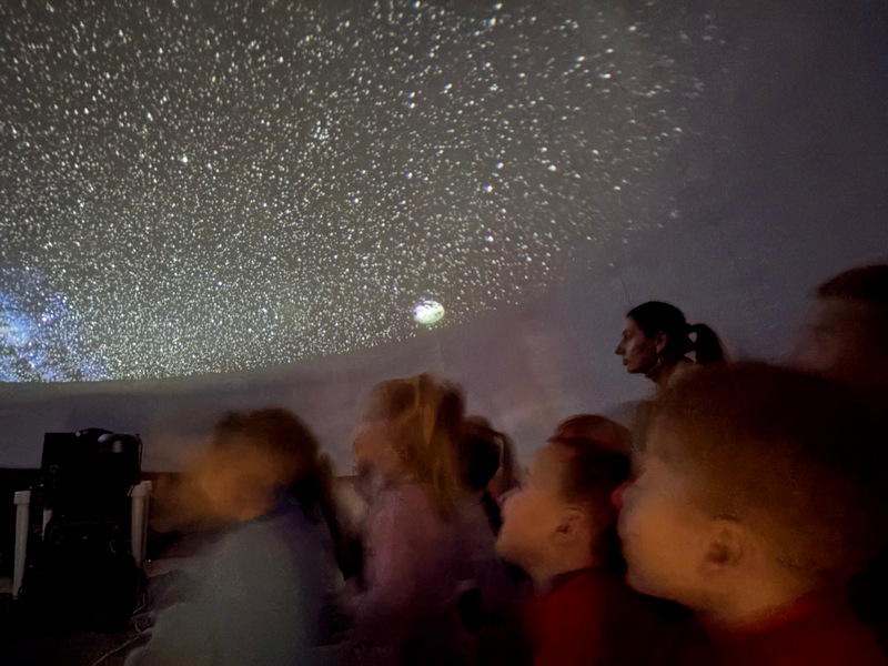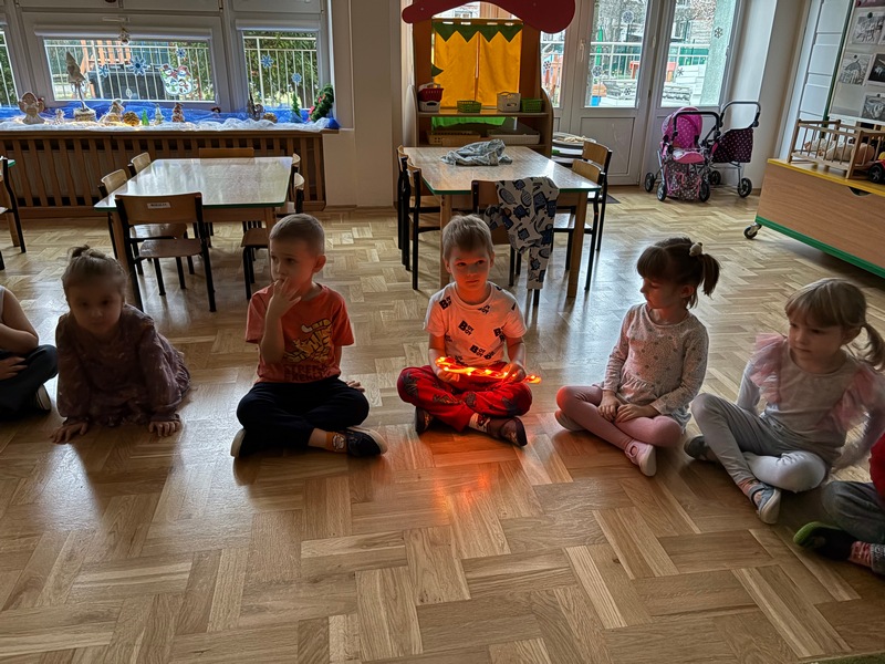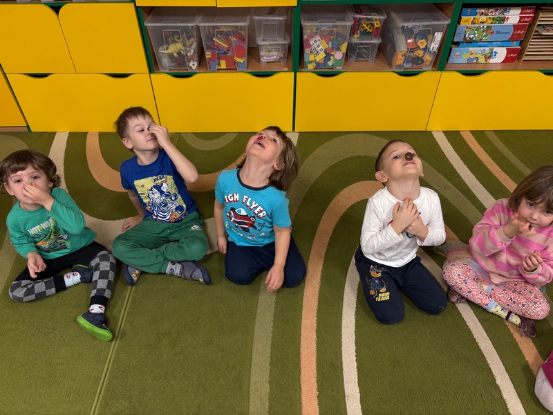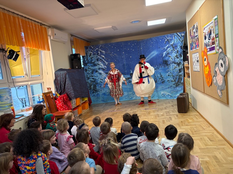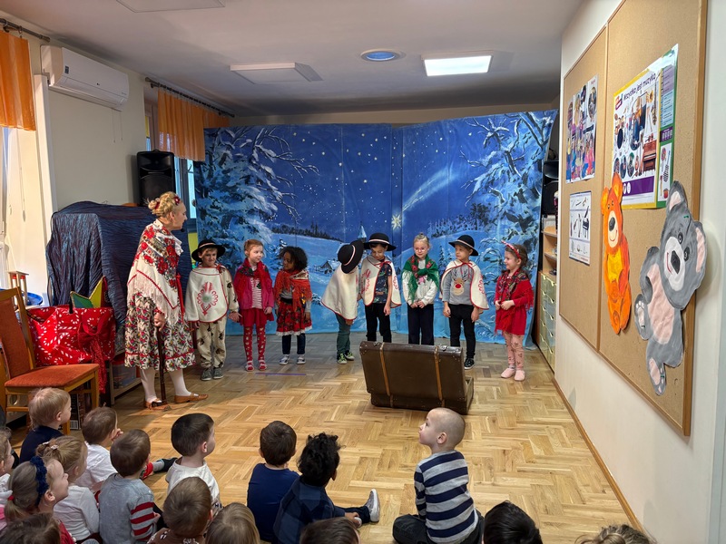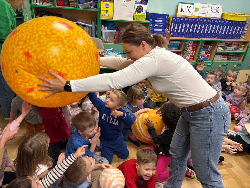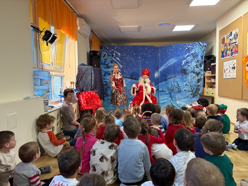 …wydarzeniem miesiąca było dla nas spotkanie ze Św. Mikołajem, który odwiedził nas aż dwa razu: szóstego grudnia i tuż przed świętami. Za pierwszym razem bardzo się spieszył, dlatego wręczył nam list informujący o niespodziance jaką dla nas przygotował – udziału w warsztatach „Mikołajkowe Planetarium”. Drugie spotkanie trwało znacznie dłużej – były wspólne zabawy, tańce i śpiewanie kolęd. Każdy z nas zrobił sobie zdjęcie z tym niezwykłym gościem i odebrał swój prezent.