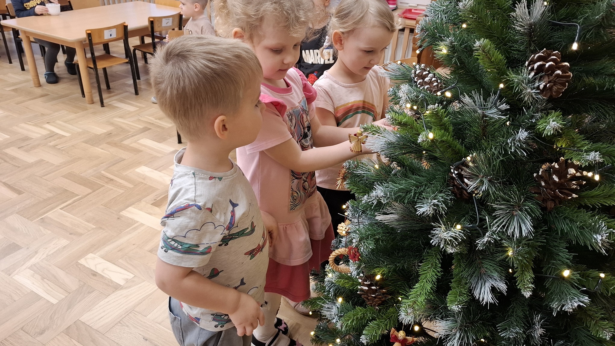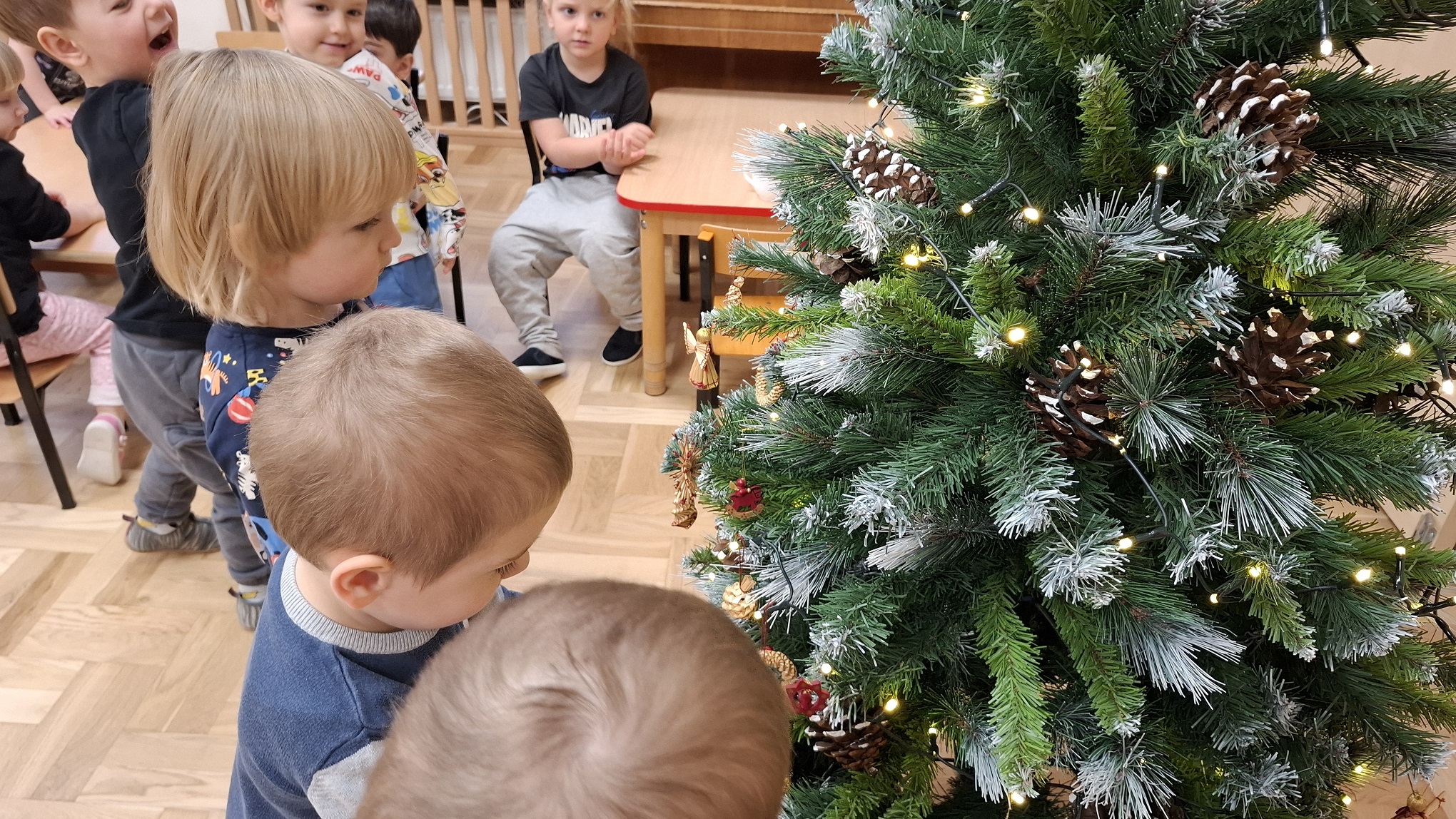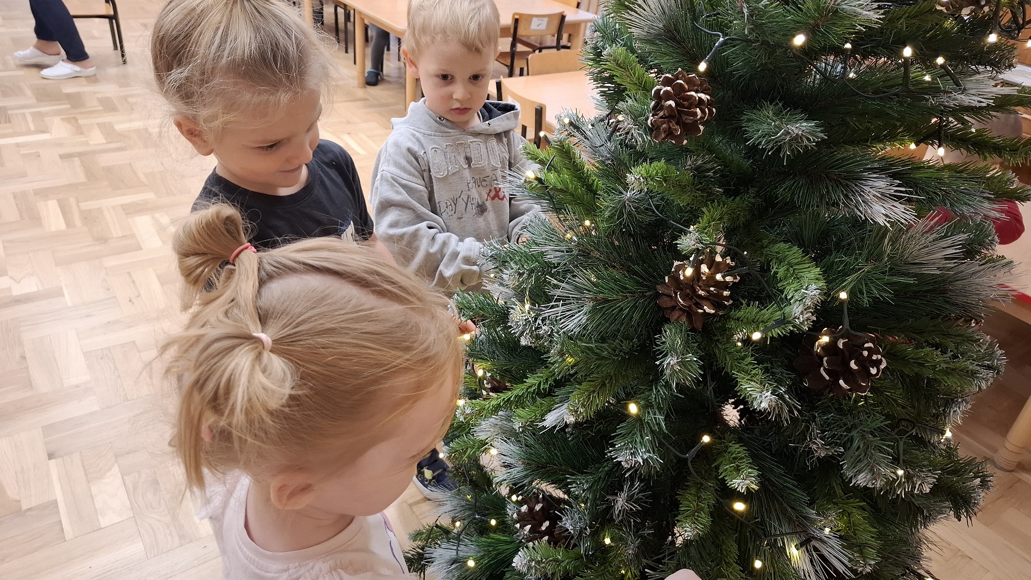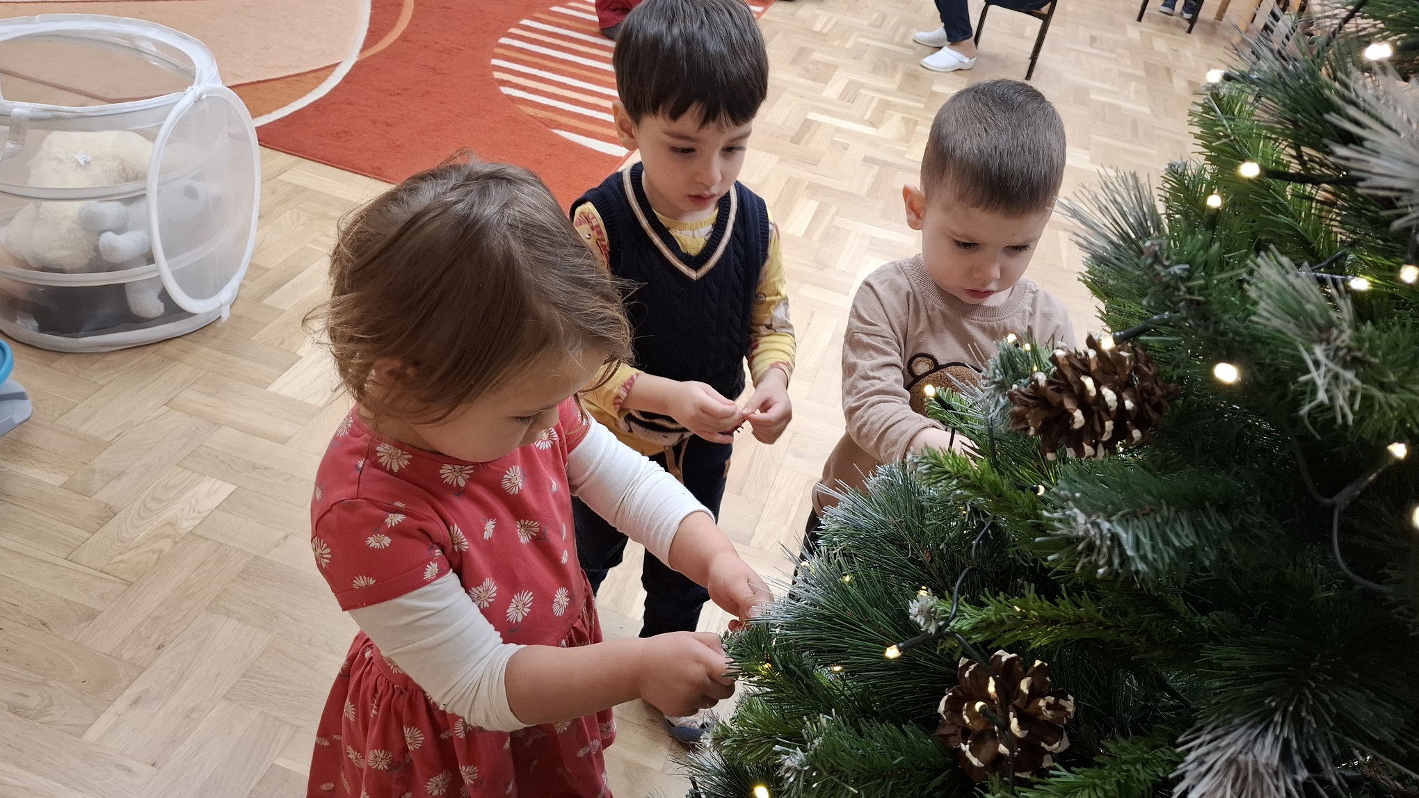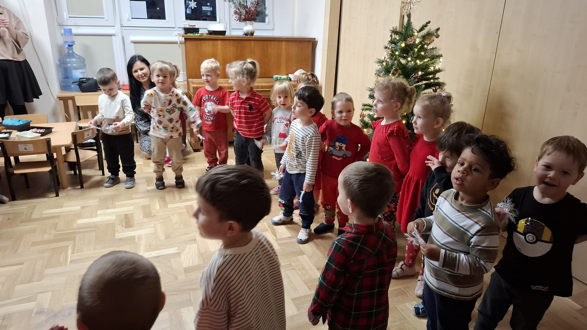 Grudzień w grupie 3-latków upłynął w radosnej, świątecznej atmosferze i obfitował w wiele ciekawych wydarzeń. Miesiąc rozpoczęliśmy od świątecznych warsztatów z udziałem rodziców, podczas których dzieci wspólnie z bliskimi tworzyły bożonarodzeniowe ozdoby. Był to wyjątkowy czas integracji, współpracy oraz budowania ciepłych relacji. Z okazji Mikołajek dzieci wzięły udział w seansie w planetarium, który przeniósł je w niezwykły świat gwiazd i kosmosu. Magiczna atmosfera, światła i obrazy wzbudziły duże zainteresowanie oraz zachwyt najmłodszych. Kolejnym wydarzeniem były warsztaty LabOdkrywcy „Kolorowe jony”, podczas których dzieci w przystępny sposób poznały świat nauki. Dowiedziały się, że kolorowe jony mogą pomagać człowiekowi w walce z bakteriami, rozwijając ciekawość poznawczą i zainteresowanie otaczającym światem. W grudniu nie zabrakło także aktywności ruchowej. Zajęcia Roar Dance dostarczyły dzieciom mnóstwo radości, pozwoliły rozładować energię oraz rozwijały koordynację ruchową i poczucie rytmu. Miesiąc zakończyliśmy wyjątkowym spotkaniem z Mikołajem, które wywołało wiele uśmiechów i emocji. Dzieci z radością przywitały gościa, śpiewały piosenki i otrzymały drobne upominki. Grudzień był dla naszych 3-latków czasem pełnym zabawy, nauki i świątecznego ciepła, który na długo pozostanie w ich pamięci.