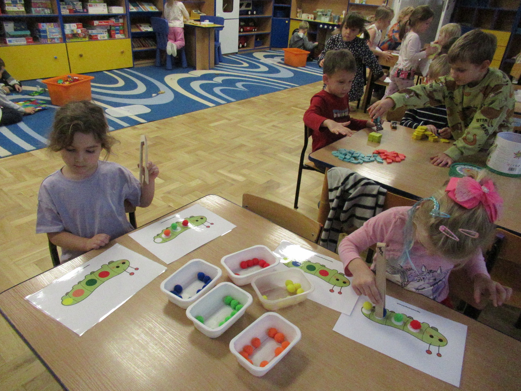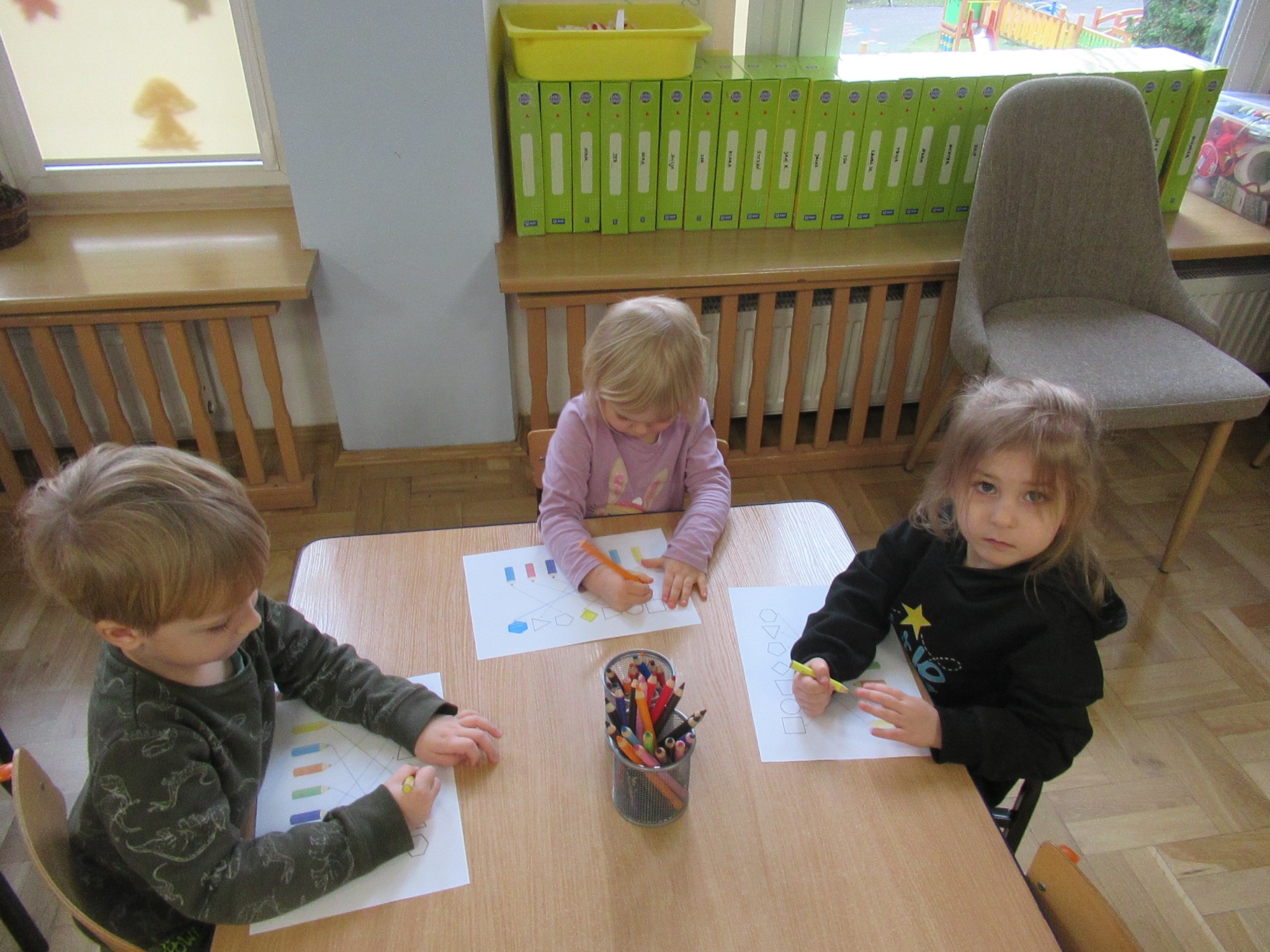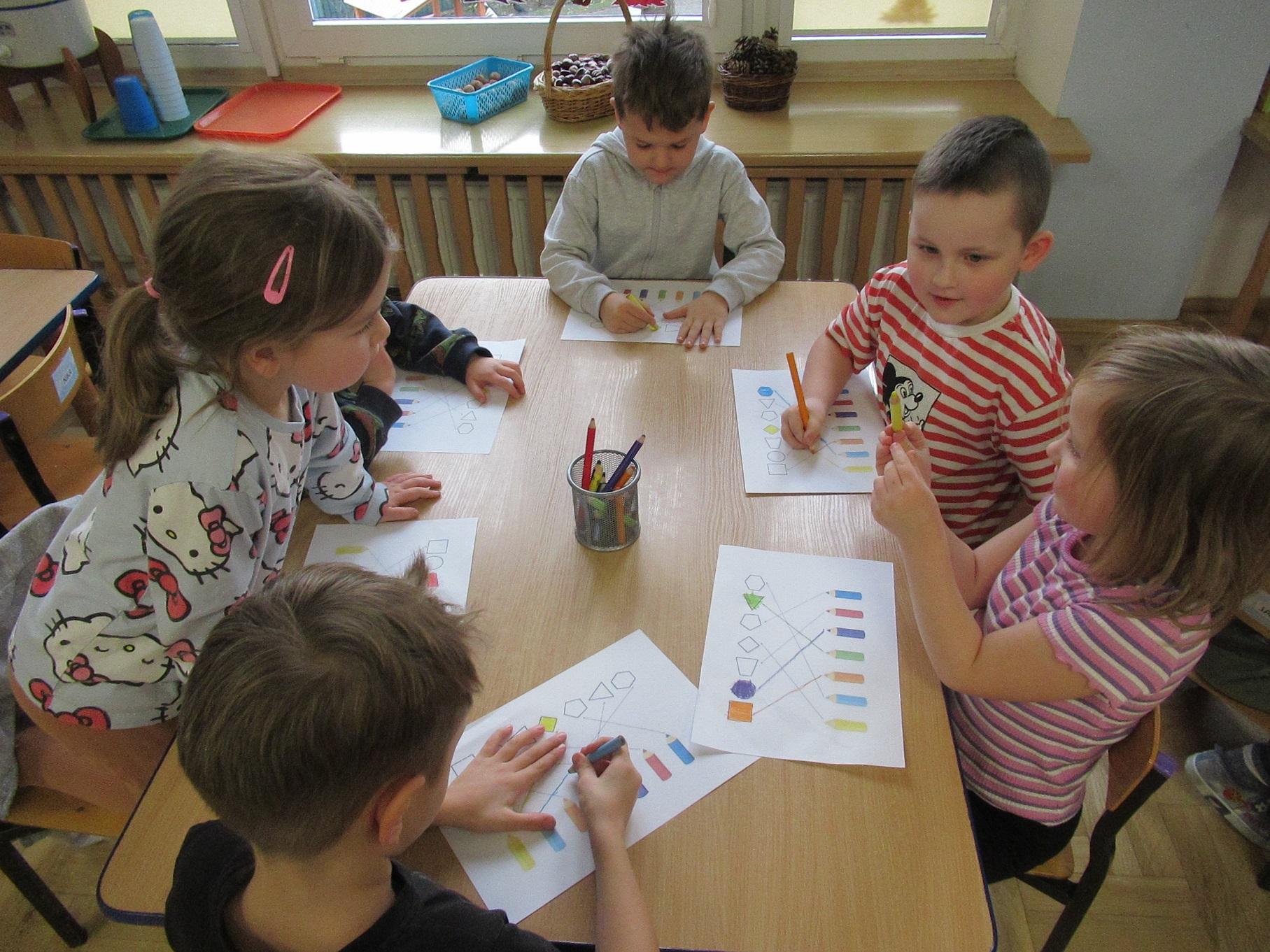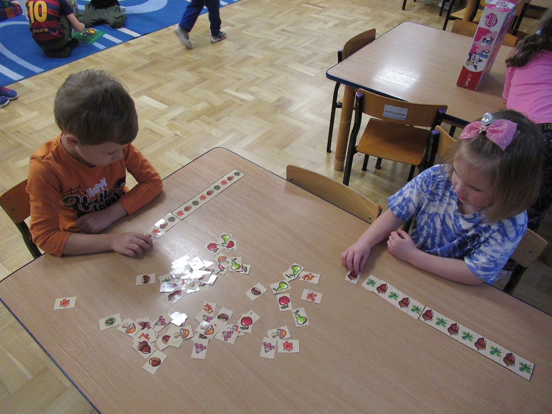 Nie zapomnieliśmy również o realizacji tematu planu rocznego:” Matematyka w czterech porach roku”. W tym miesiącu zajmowaliśmy się rytmami. Samodzielnie tworzyliśmy i kontynuowaliśmy rytmy z różnych materiałów przyrodniczych. Wyszukiwaliśmy również rytmów w codziennym życiu, takich jak dzień i noc, cykliczność dni tygodnia, miesięcy i pór roku. Odtwarzaliśmy także rytmy dźwiękowe. Wykonywaliśmy też różne karty pracy związane z kontynuowaniem określonych sekwencji zgodnie z podanym wzorem.