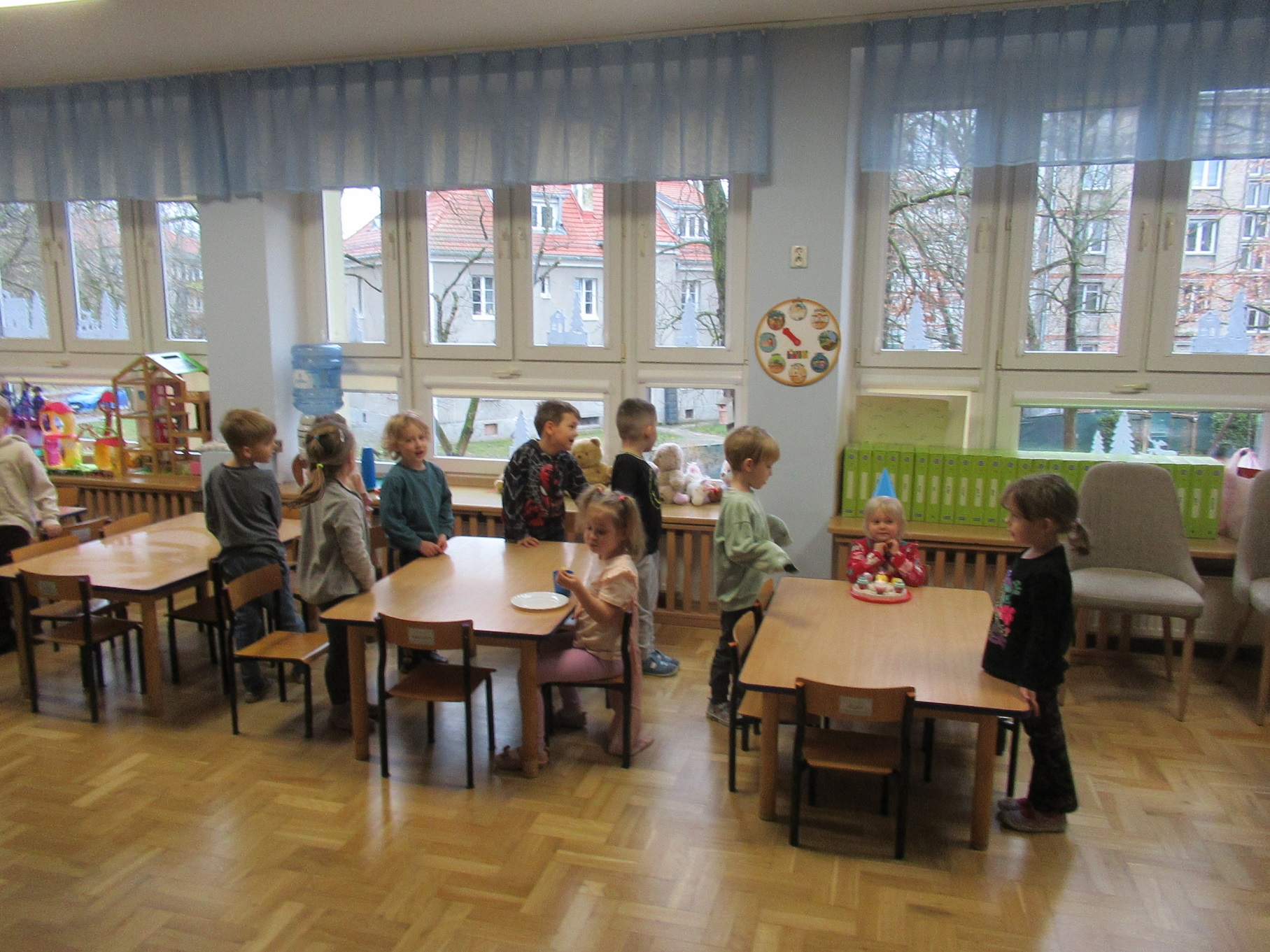 Świętowaliśmy urodziny jednej dziewczynki z naszej grupy. Były życzenia, pamiątkowa książeczka z rysunkami od kolegów i koleżanek oraz poczęstunek przyniesiony przez rodziców.