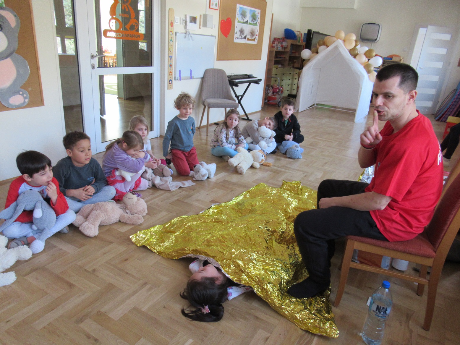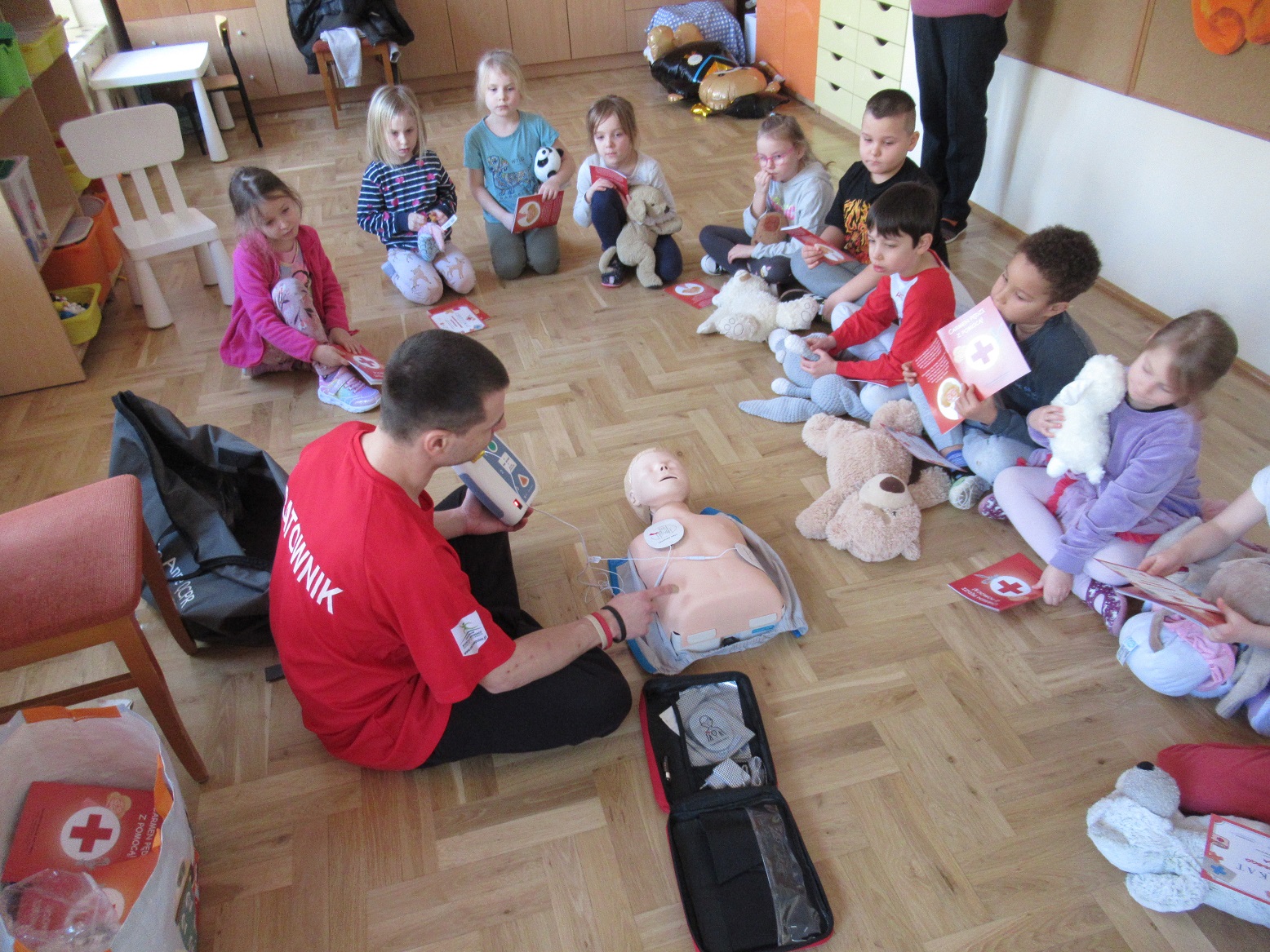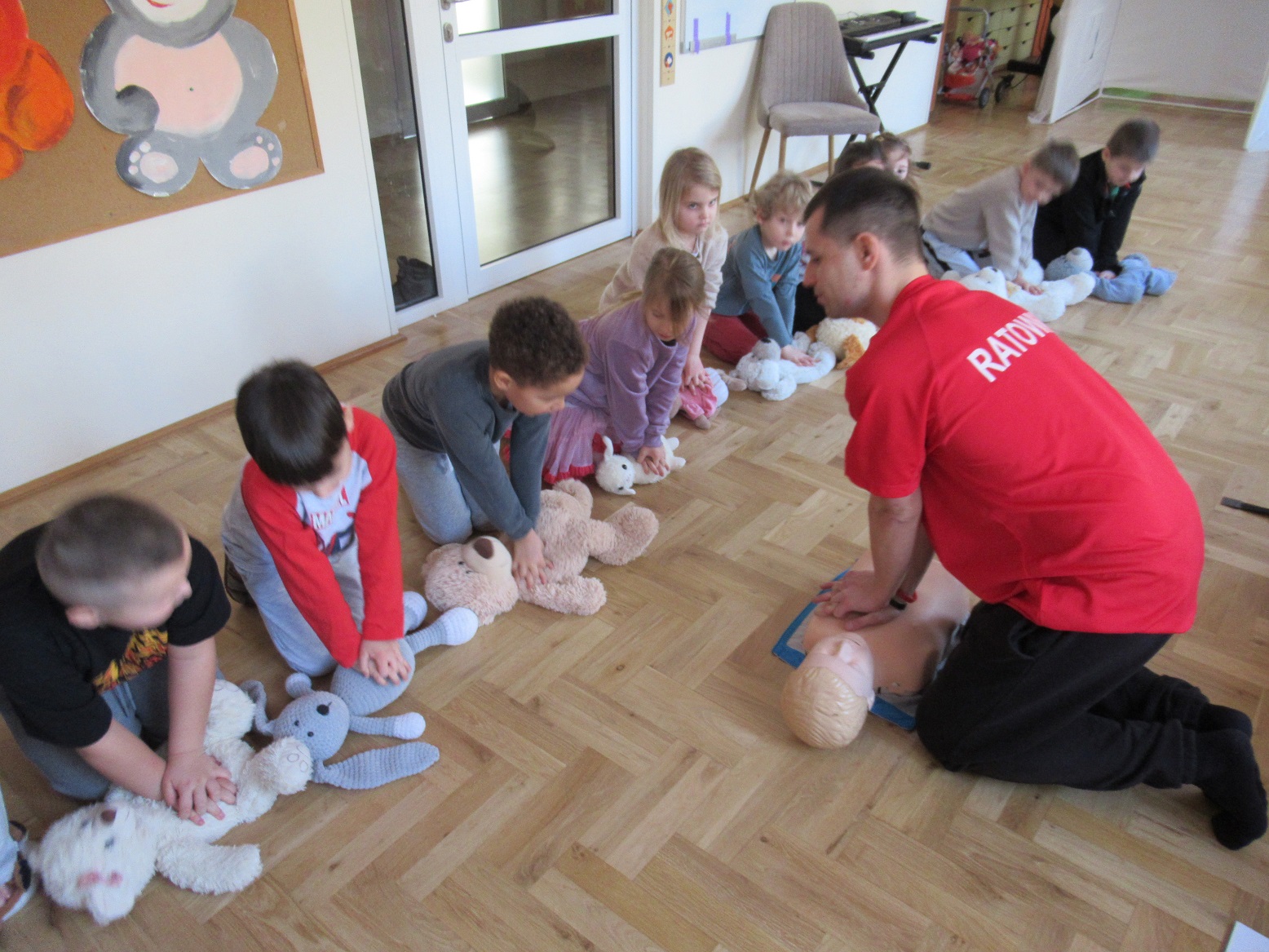Uczestniczyliśmy w warsztatach z pierwszej pomocy „Akademia Małego Ratownika”. Odwiedził nas ratownik, który opowiadał dzieciom o różnych zagrożeniach oraz pokazywał, jak udzielać pierwszej pomocy. Dzieci ćwiczyły na swoich przytulankach. To były bardzo ciekawe i pouczające zajęcia.