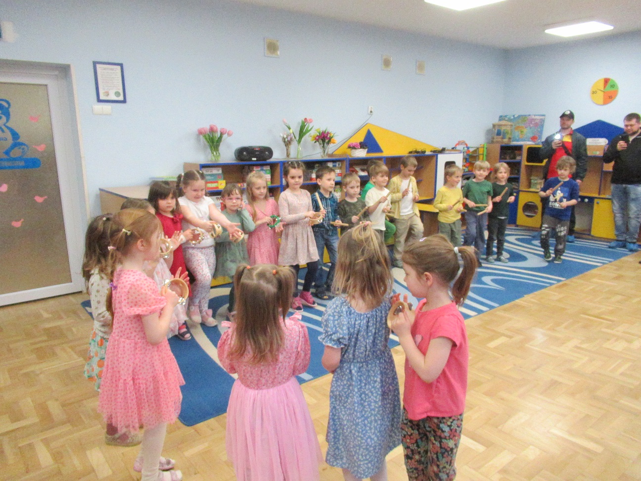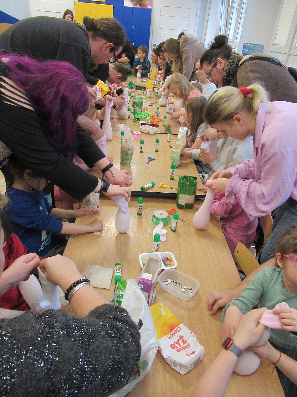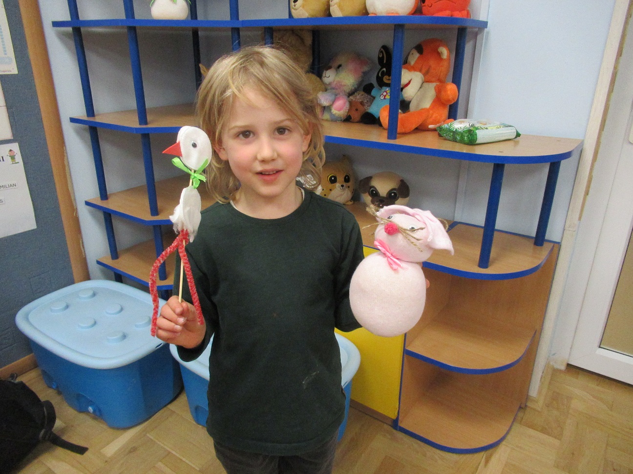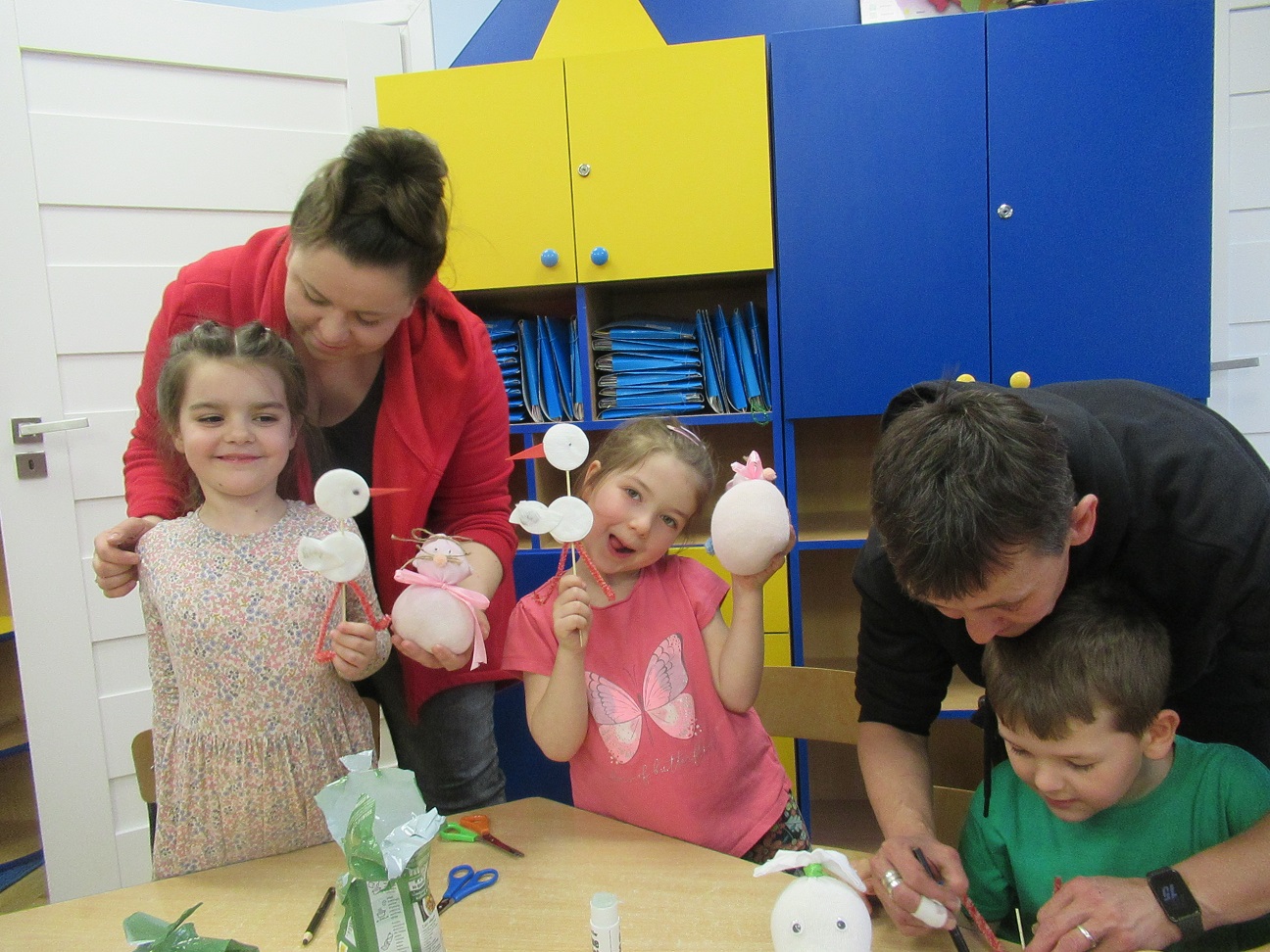 25.03. w naszej grupie niebieskiej odbyły się Warsztaty wiosenno - wielkanocne z rodzicami. Wszystkich gości przywitaliśmy piosenką, tańcem i grą na instrumentach. Następnie zaprosiliśmy Rodziców do wspólnej zabawy muzyczno - naśladowczej. Wreszcie przystąpiliśmy wspólnie z rodzicami do zrobienia zajączka wielkanocnego ze skarpetki i bociana z płatków kosmetycznych. Było bardzo miło i radośnie.