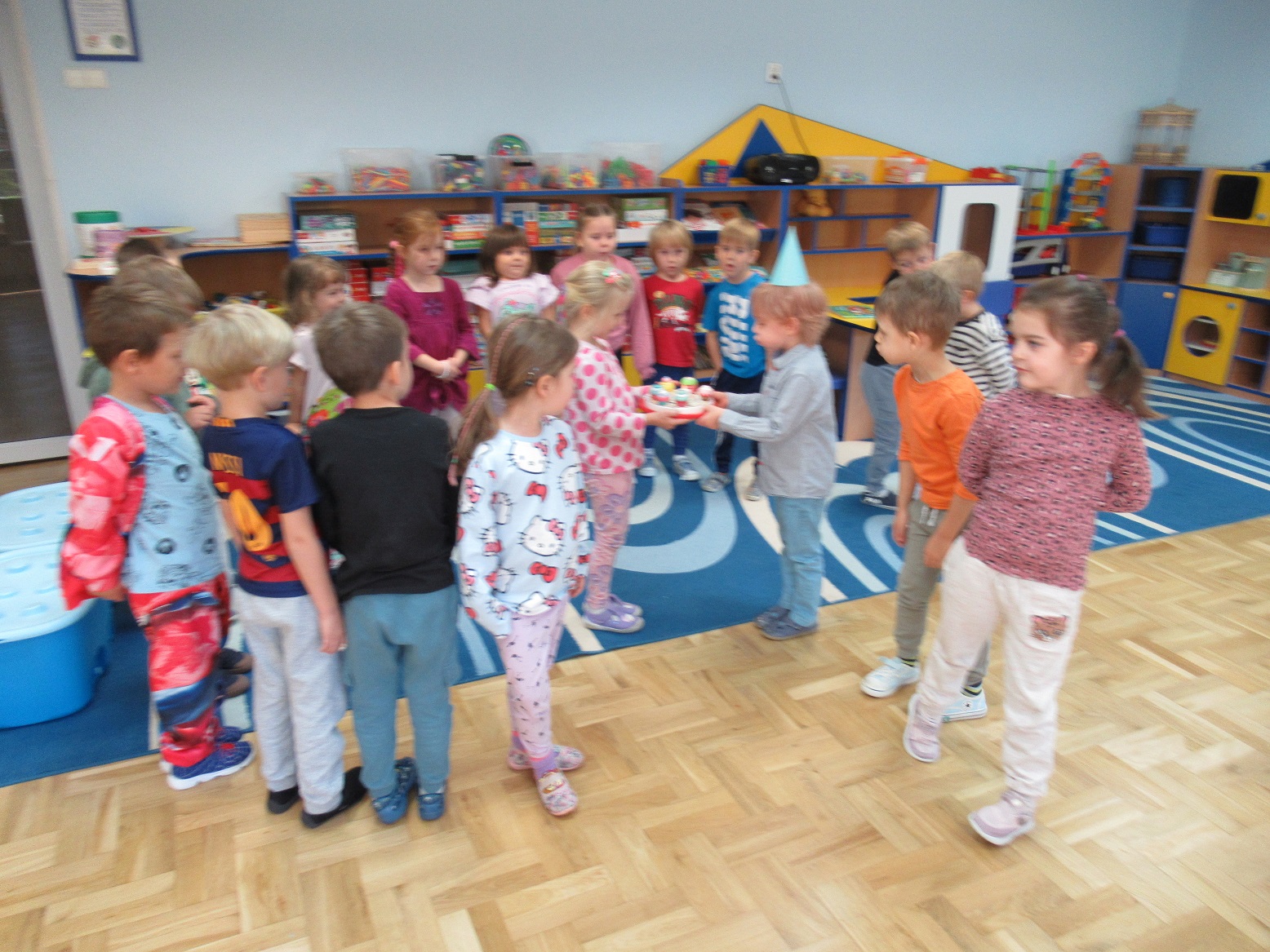 W tym miesiącu świętowaliśmy urodziny kilkorga dzieci z naszej grupy. Były życzenia, dmuchanie świeczki z zabawkowego tortu, pyszny poczęstunek oraz prezent od grupy – „książeczka urodzinowa”.
