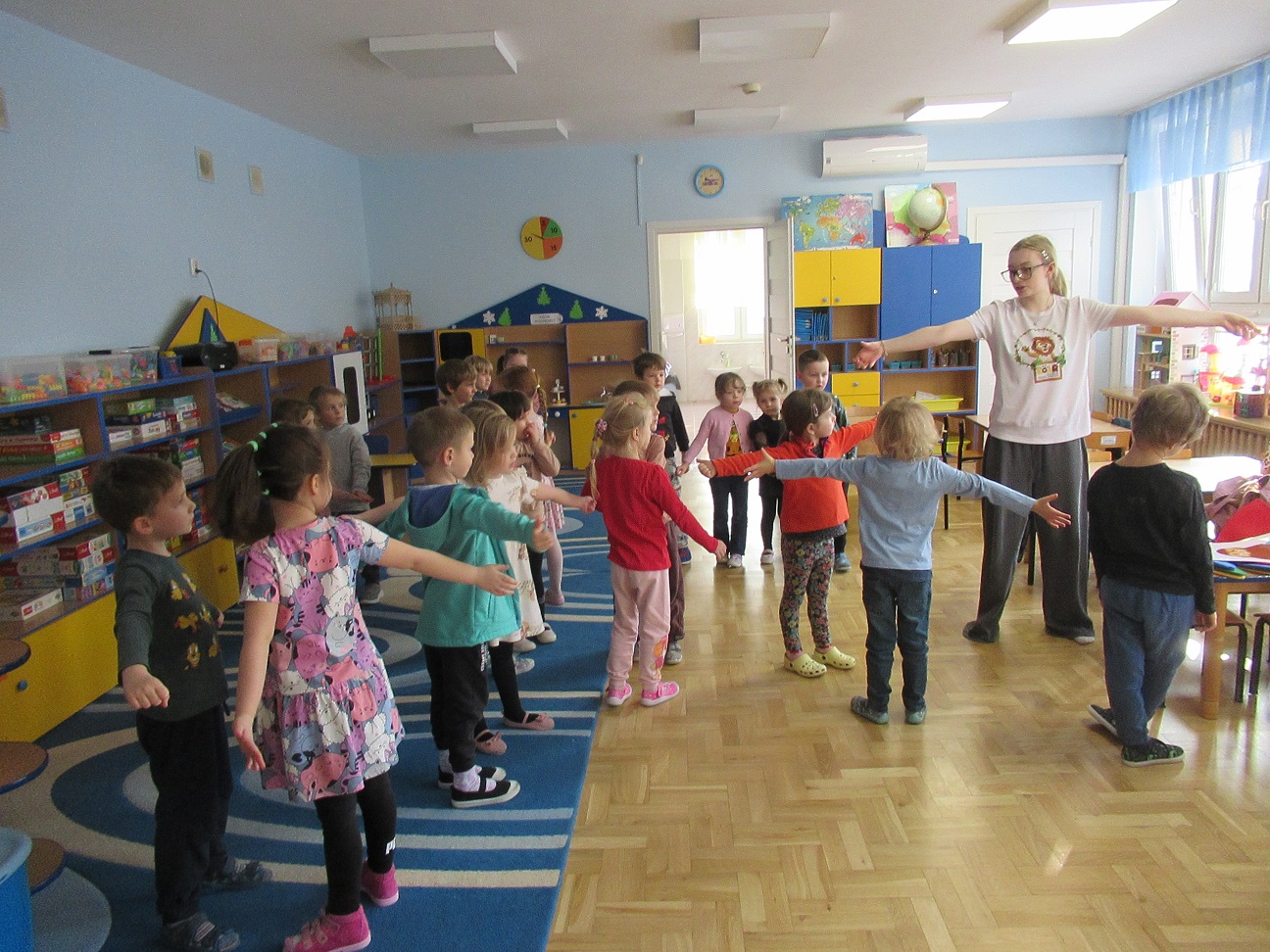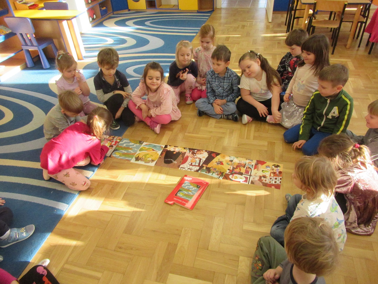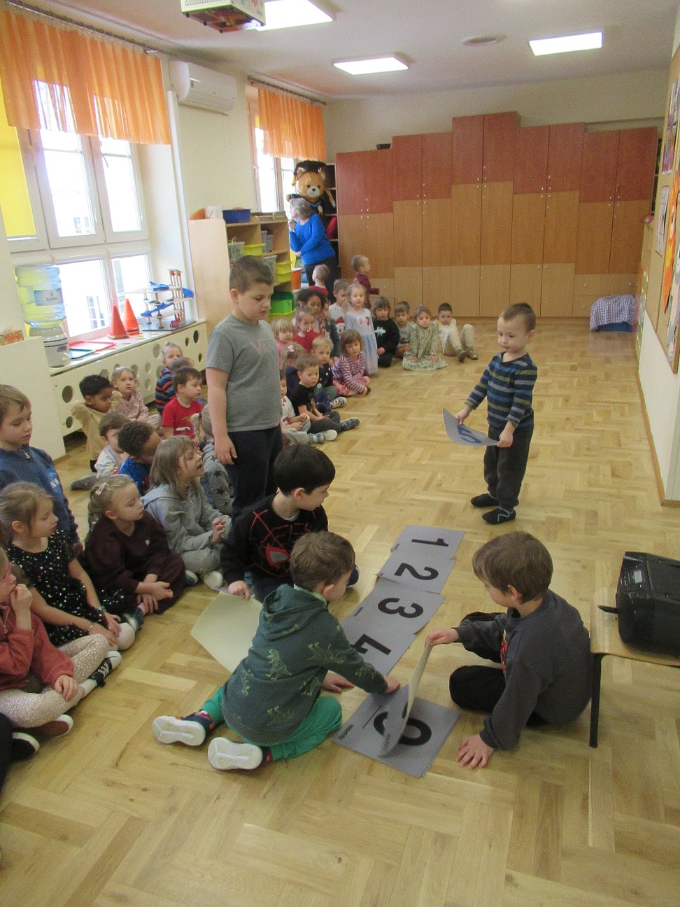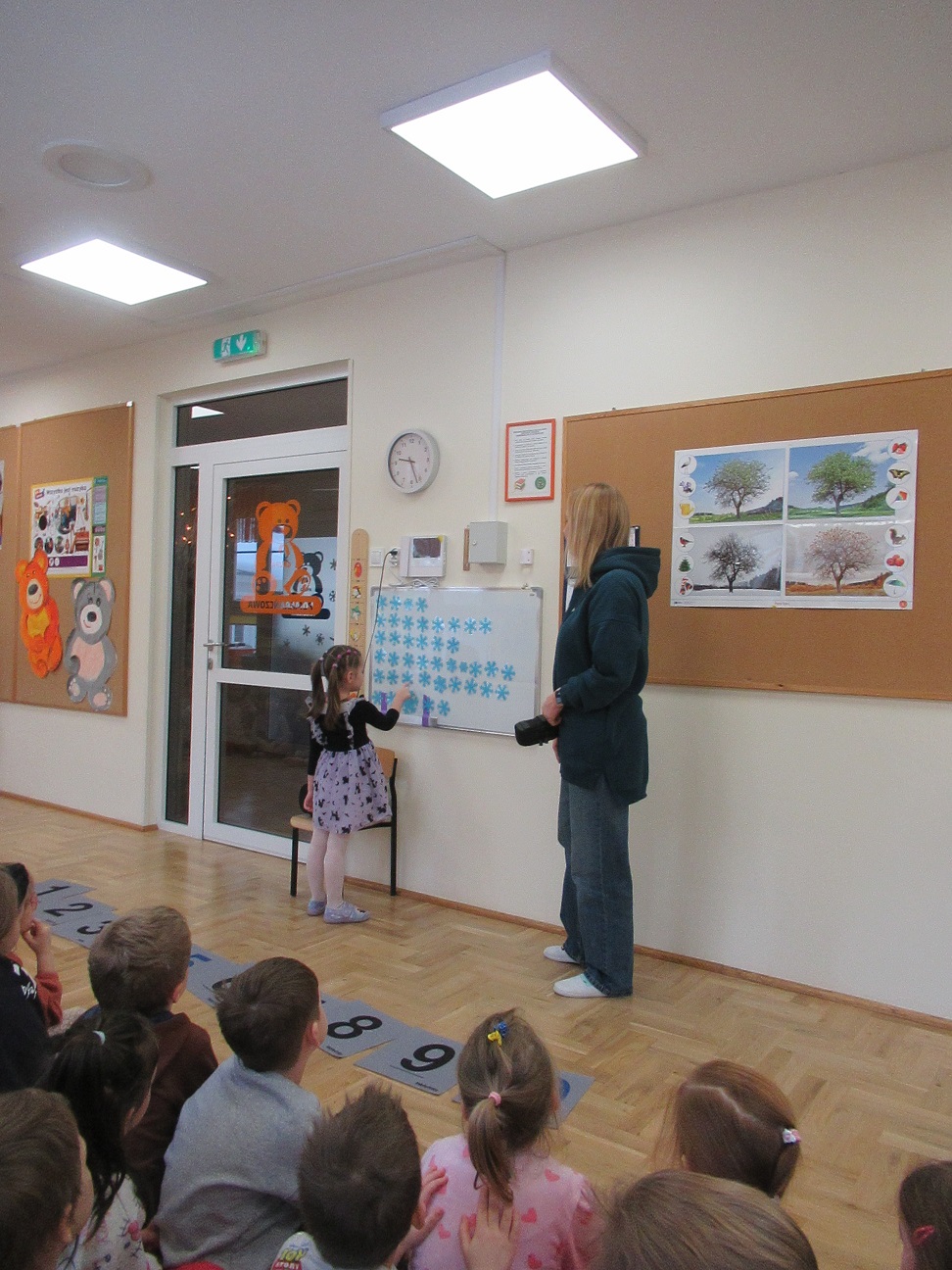 Przede wszystkim, w ramach realizacji tematów planu rocznego: „ Matematyka w czterech porach roku” kształtowaliśmy umiejętności liczenia w zakresie dziesięciu. Natomiast podróżując z Pluszowym Misiem po Polsce udaliśmy się do województwa małopolskiego. Pierwszym przystankiem był dla nas Kraków. Zapoznaliśmy się z zabytkami tego miasta. Powędrowaliśmy na Starówkę, gdzie przywitało nas wiele gołębi. Poznaliśmy również legendę o Smoku Wawelskim.